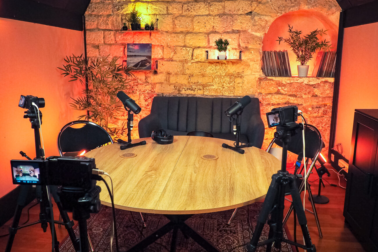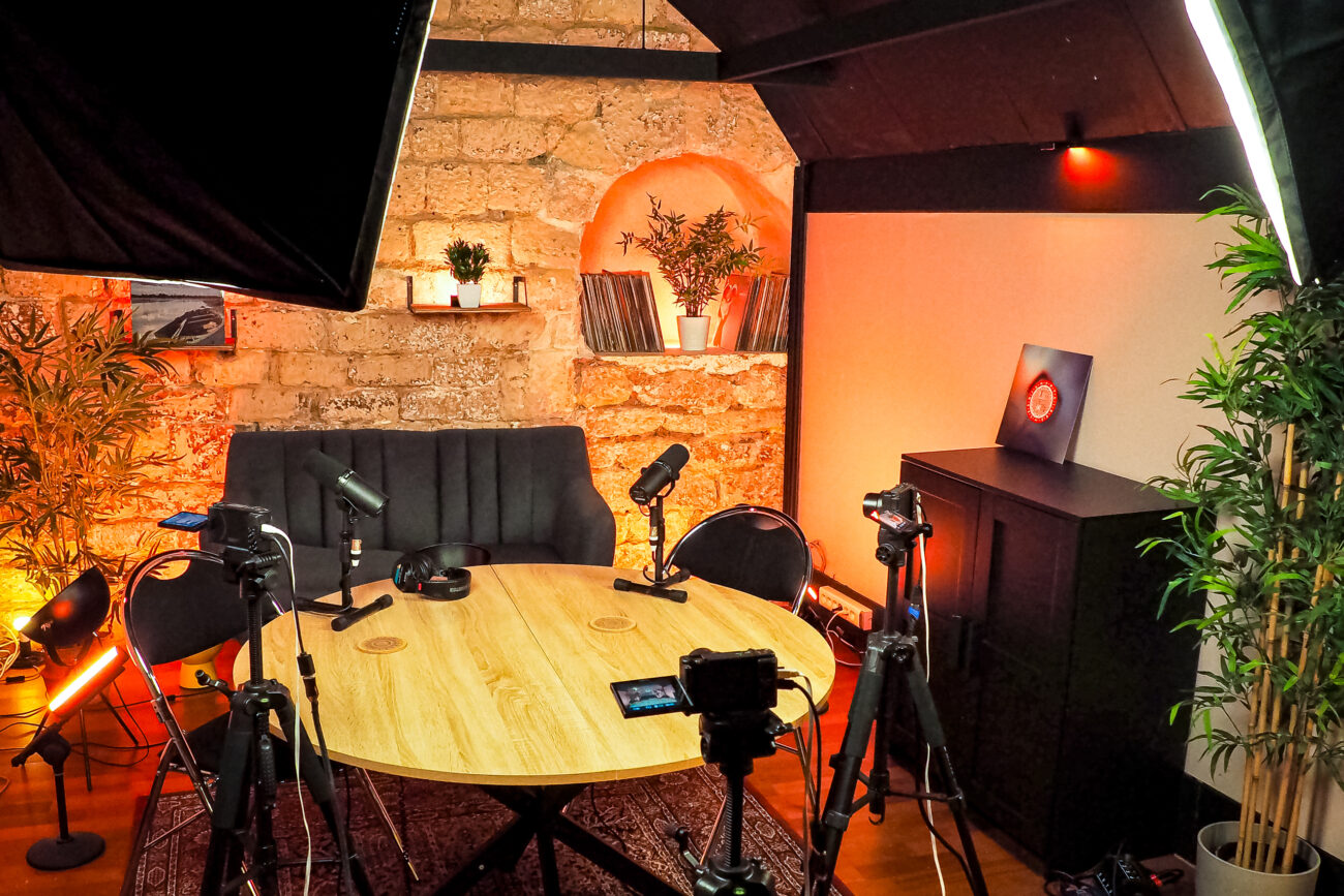 La demande croissante des auditeurs de pouvoir voir les coulisses de l’enregistrement d’un podcast, et de pouvoir visualiser les visages derrière les voix qu’ils entendent impose désormais de pouvoir filmer tout podcast si besoin. Doté d’un plan large et deux plans serrés, et pouvant monter jusqu’à 5 micros en simultané, notre plateau de tournage s’adapte à tout type de talk, de la simple interview au débat.