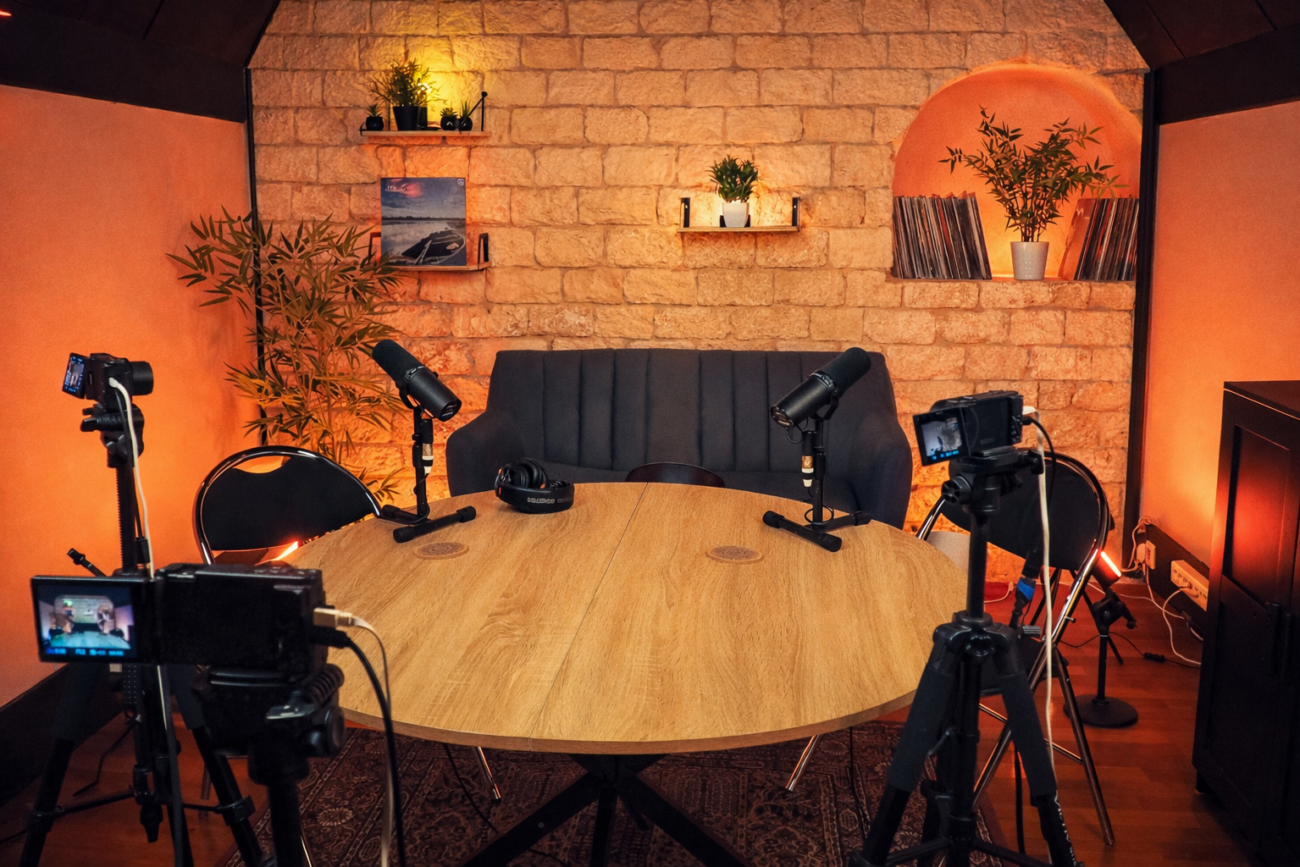 La demande croissante des auditeurs de pouvoir voir les coulisses de l’enregistrement d’un podcast, et de pouvoir visualiser les visages derrière les voix qu’ils entendent impose désormais de pouvoir filmer tout podcast si besoin. Doté d’un plan large et deux plans serrés, et pouvant monter jusqu’à 5 micros en simultané, notre plateau de tournage s’adapte à tout type de talk, de la simple interview au débat.
